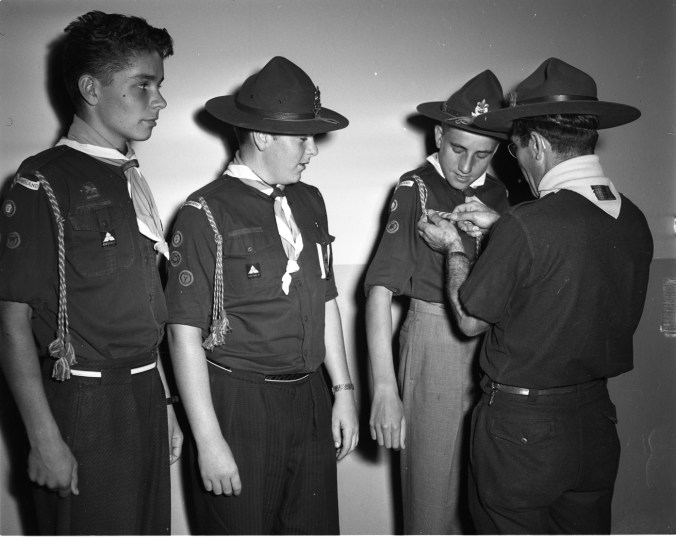 Last Monday was a big night for six members of 3rd Midland (Knox) Scout Troop as they received their first class badges and all round “A ” group cords. In the upper photo, District Commissioner H. H. Boyd shows Dietmar Wagner how to fix new cord while Lynn Johnston, left, and Iain Brownlee watch. In the lower picture are, left to right, Scout Master John Brownlee, Rodney Todd, Jack Ambrose, and Harry DeVries. After a probationary period of six months, the lads hope to become Queen’s Scouts.