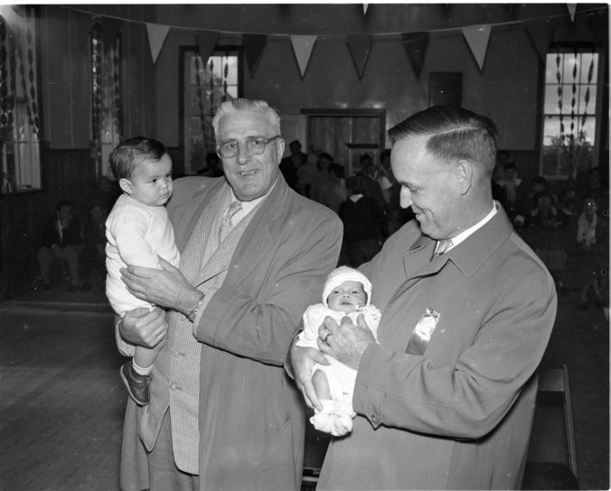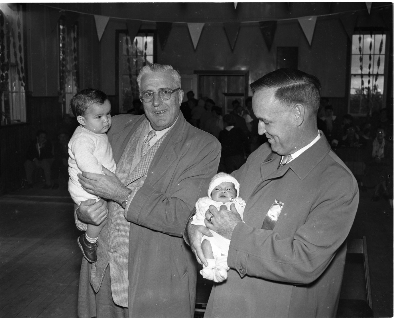 “Two top babies entered in Christian Island’s Achievement Day baby contest are shown here with judges. Left, Dr. P. B. Rynard, M.P., holds David Sylvester, while R. B. Cowan displays the youngest baby, Beverley Mixemong. “