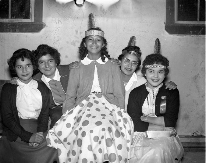 “Christian Island Indians held a beauty queen contest during their Achievement Day program last week and this quintet emerged as winners. Juanita Marks, centre, was chosen Queen. Girls are, left to right, Dorothy Monague, Donna Sandy, Juanita Marks, Dorothy McCue, and Judy Monague. “