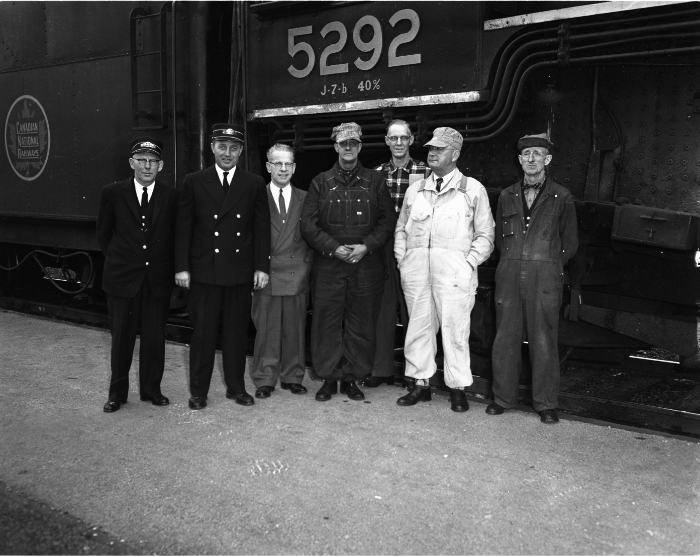 The historic picture above marked the departure of the last CNR passenger train from Midland, Saturday, October 25th. The cut-off meant the end of a service Midlanders have had for nearly 80 years. Left to right, Conductor Roy Whitney, brakeman Harvey Wallace, Midland, agent Frank Whiteman, fireman Jack Rowell express agent Harwood Gosselin, engineer Jack Cochrane, baggage man Roy Head.