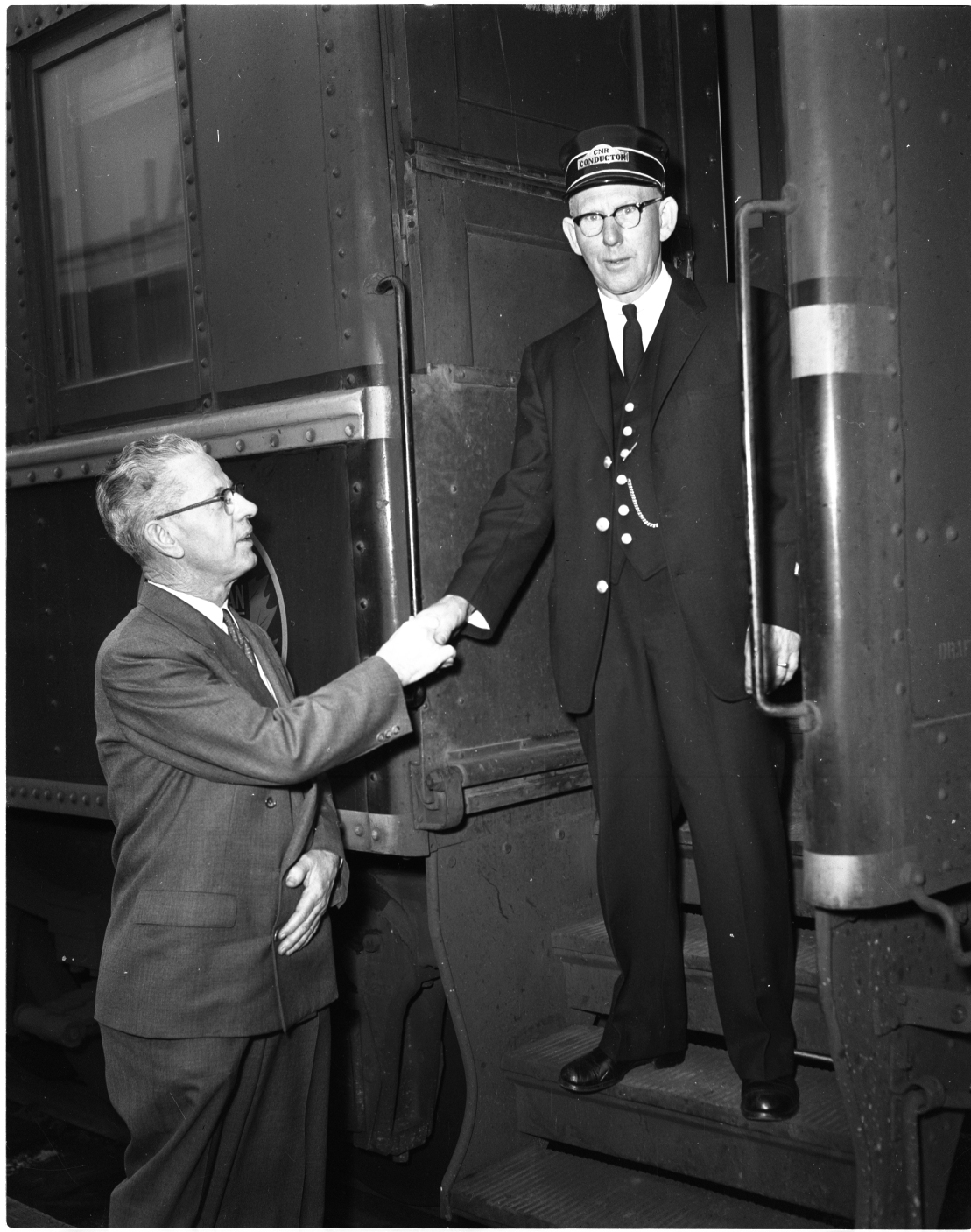 The smiles look a little forced, as indeed they were when CNR agent Frank Whiteman, left, shook hands with conductor Roy Whitney as the afternoon train left Midland Saturday. It was the last regular passenger train to leave Midland. The service has been discontinued because of a lack of passenger revenue in recent years.