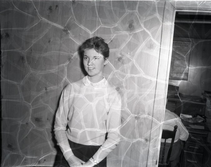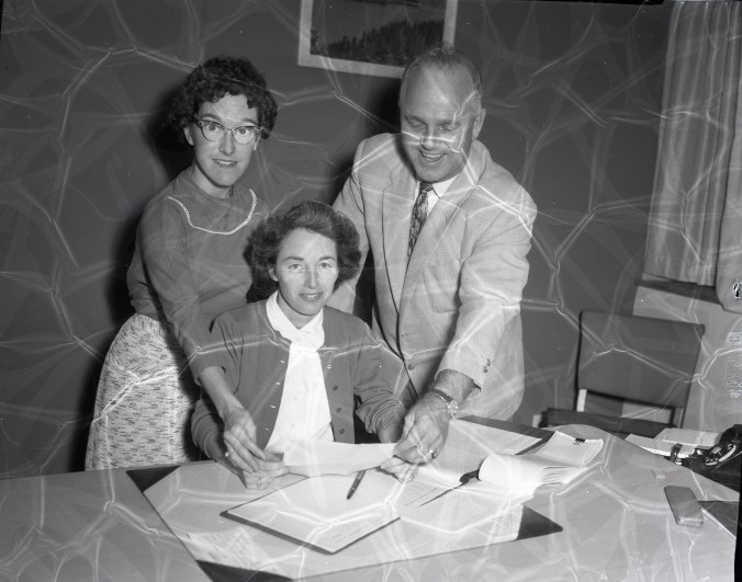 Accountant for the town of Midland, Miss Hilda Martin (seated) could be $140,000 richer if a horse named Aggressor wins the Cambridgeshire Handicap in England this morning. Sharing Miss Martin’s pleasure upon receiving word she had a ticket on the event are Miss Norine Bell and William Hack, clerk-treasurer of Midland. (The “crackling” on the photo is the result of the negative being stored for 60 years and the reason the Museum is actively digitizing the Free Press collection.)