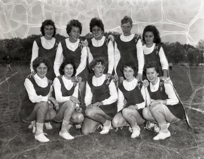 Both MPDHS football teams are enjoying another good season on the field this year, aided and abetted by their pretty cheerleaders. Girls are, left to right, front row —Gail Richardson, Junia Corcoran, Mary Lou Brissette, Rosemary Shiels, Marilyn Thompson; back row—Gail Rankin, Shirley Newton, Marion Lavigne, Betty Ann McCullough, Carol VanLuven.