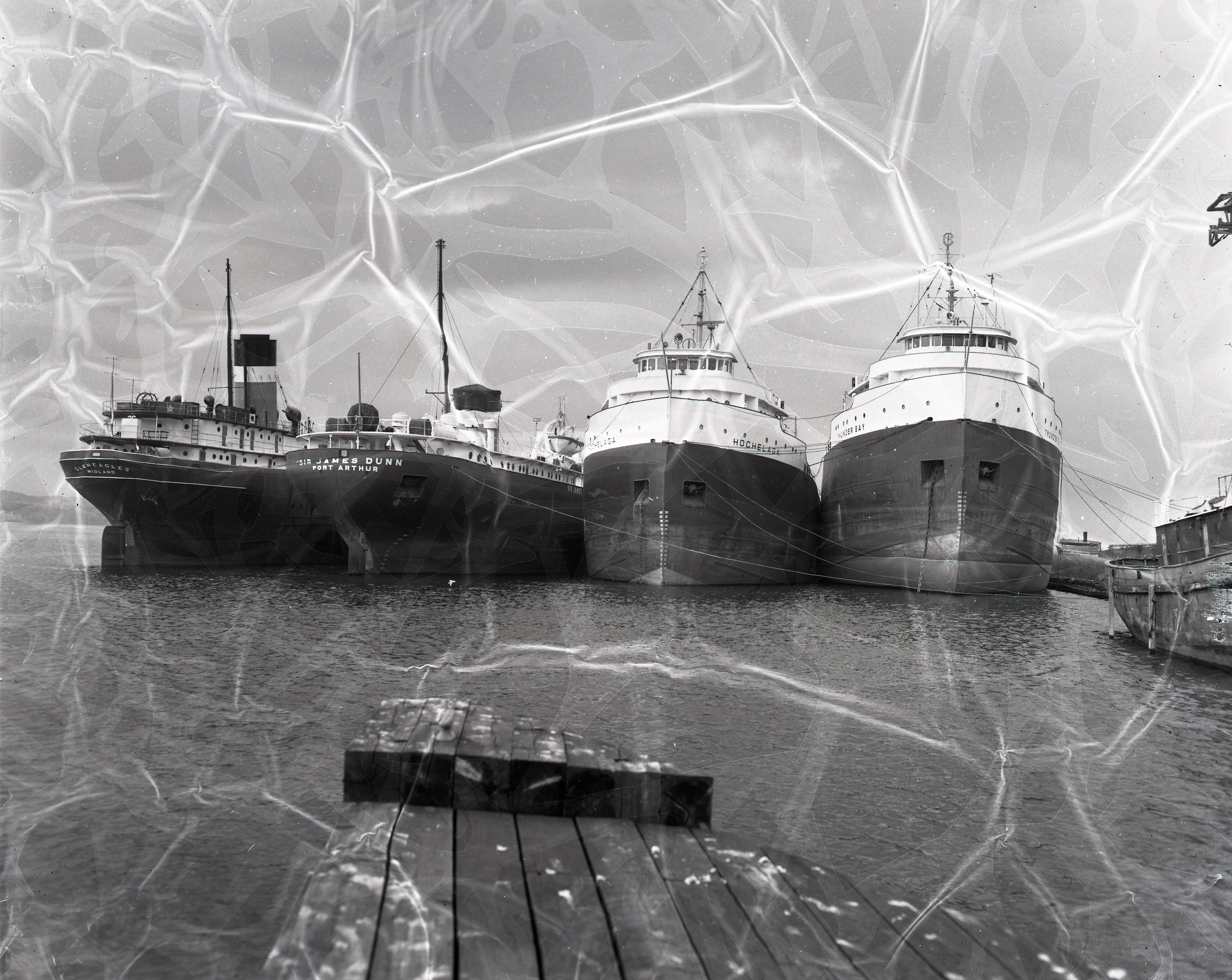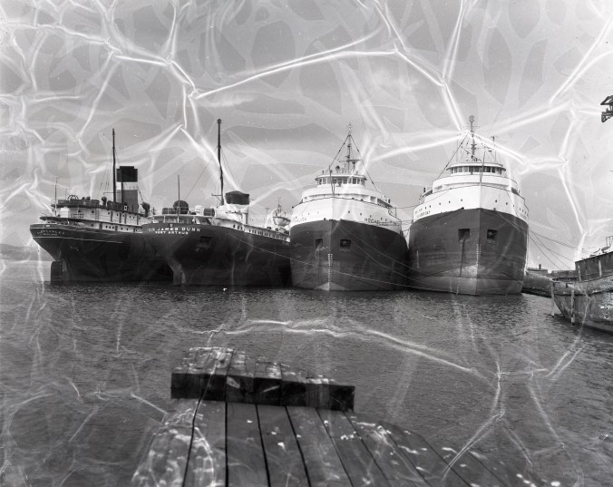 Getting a birds’ eye and a tail-end view of the situation are these four big freighters tied up at the shipyard in Midland harbor. The view from either end, as far as lake shipping is concerned, is far from pleasant. These four giants, along with four smaller ships, have been tied up for many weeks, long before the end of the navigation season. Ships are, left to right, the Gleneagles, Sir James Dunn, Hochelaga and Thunder Bay.