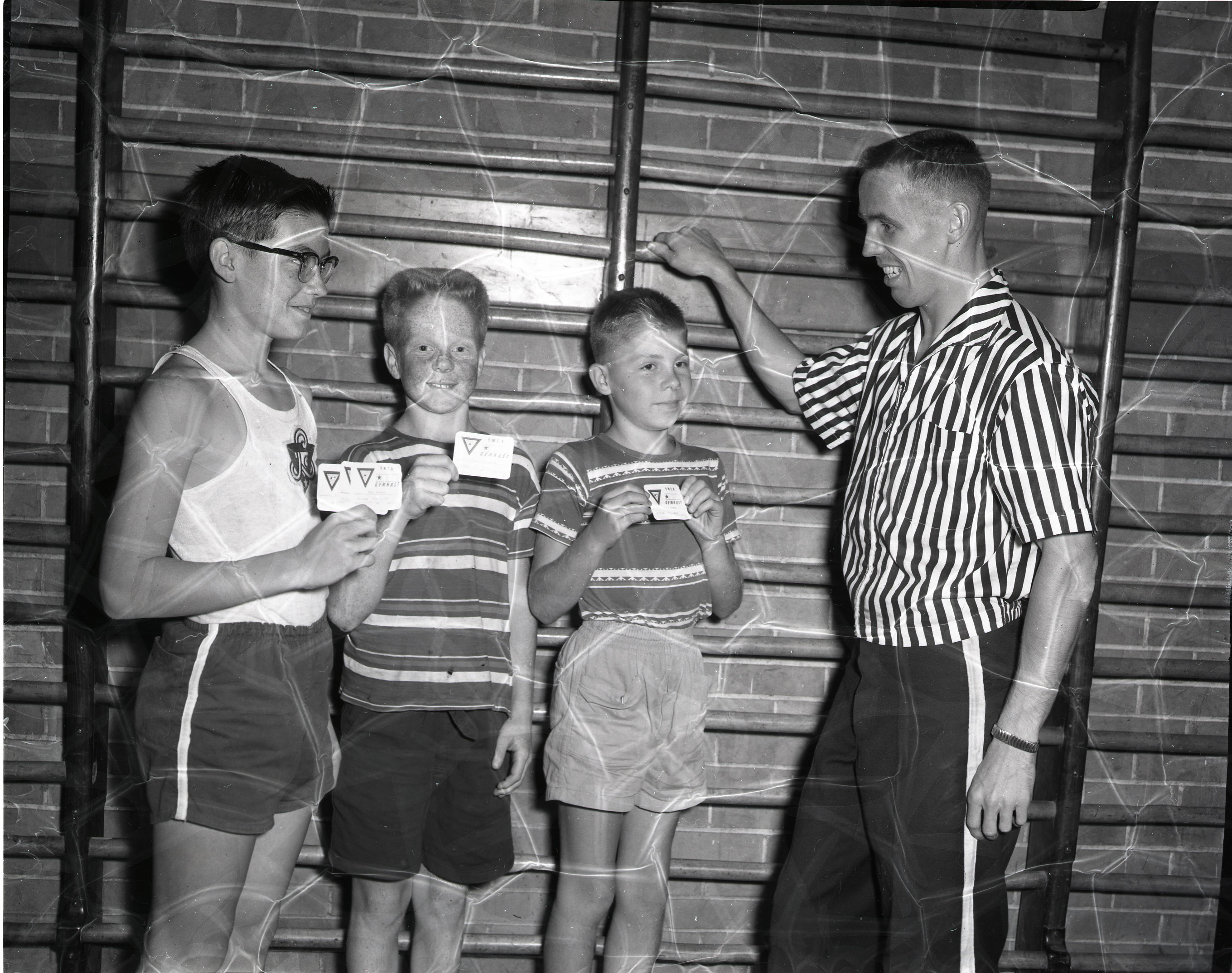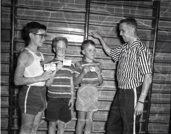 The first step towards a coveted YMCA crest are the certificates held by the three lads above. Showing their gymnastic achievement awards to Lloyd Stackhouse are, left to right, Paul Howard, Burke Thompson, and Gary Bryant. Paul is a three-star man; the other boys have one each. Campaign for funds with which to carry on this and other work at Midland ‘Y’ starts this week.