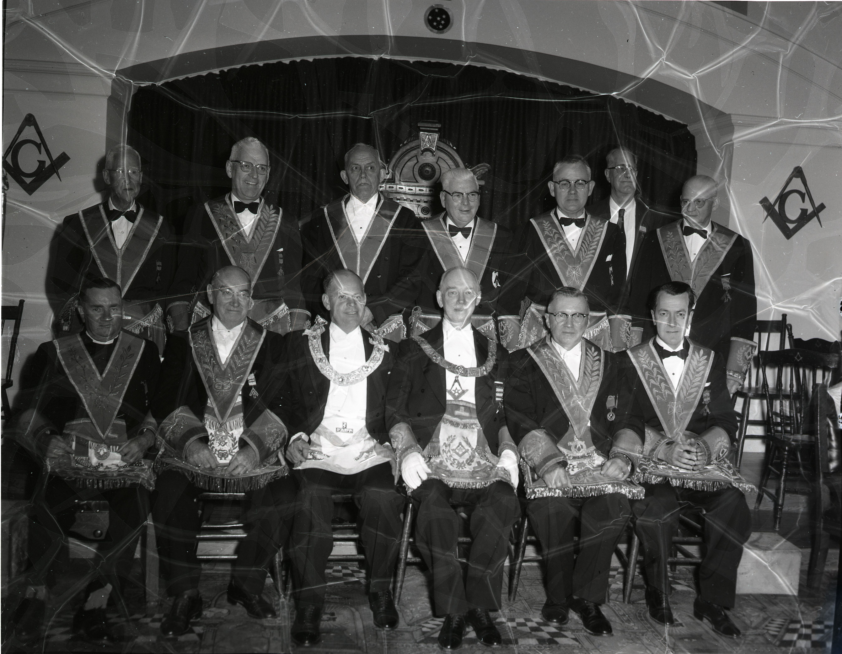 Past and present Grand Lodge officers who attended the 75th-anniversary dinner of Caledonian Lodge, Midland, Wednesday night are shown, assembled in their regalia. Left to right, front row, are Rt. Wor. Bro. R. T. C. Dwelly, formerly of Penetang, Rt. Wor. Bro. George S. Dudley, Q.C., Wor. Bro. W. M. Perrin, both of Midland, the latter master of Caledonian Lodge, Rt. Wor. Bro. C. M. Pitts, DGM of Canada, Ottawa, Rt. Wor. Bro. J. J. Robins, Midland, and Rt. Wor. Bro. J. K. McAuley, Elmvale. Back row, Very Wor. Bro. G. Clemence, Stayner, Rt. Wor. Bro. W. A. Blackburn, Stayner, Very Wor. Bro. C. A. Flowers, Midland, Very Wor. Bro. W. R. Bagley, Orillia, Rt. Wor. Bro. W. E. Bacon, Orillia, Very Wor. Bro. Robt. Trustham, Midland, and Rt. Wor. Bro. W. R. Allen of Stroud.