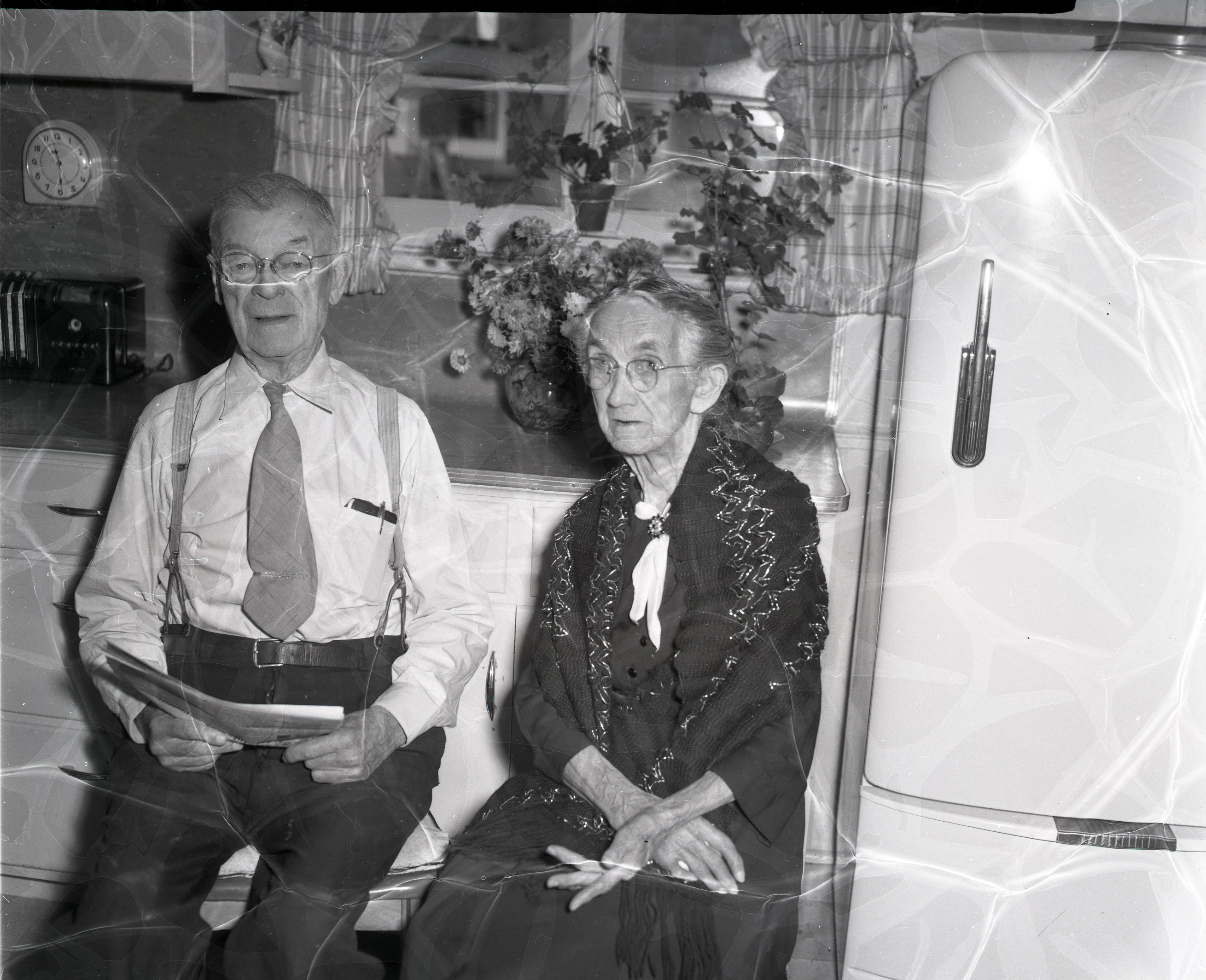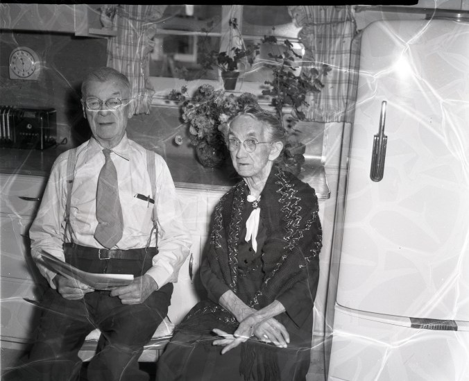 The cutting off of CNR passenger service to this area Saturday brought many memories for the two Midlanders in the photo. Mrs. Charles Laughlin, now 90, was just a child when the first train went through Fesserton. J. G. McArthur, who later had a railroad career of his own in the U.S.A., went from Port Severn with his parents to see the first train arrive at Waubaushene in the late 1870’s. Both now reside at 313 Manley Street, Midland.