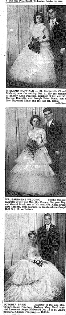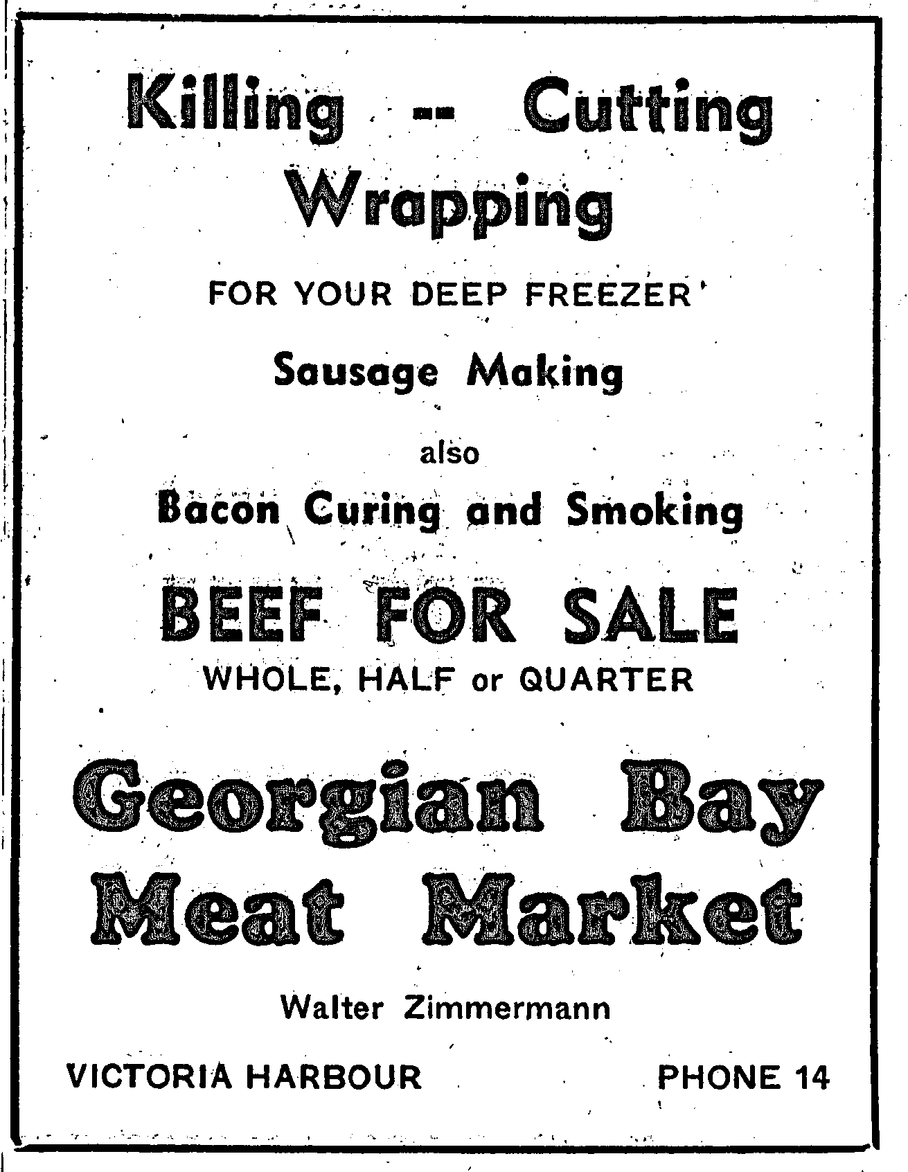 - Port McNicoll This Week – Evening Group of the United Church sponsored a bake sale last Friday afternoon in Todd’s store. The conveners were Mrs. L. Todd, Mrs. M. Lattimore, Mrs. L. Vasey, and Mrs. D. Spencer. – Mr. and Mrs. Thomas Morris and Jill arrived in Port last Friday, from Stone, Staffordshire, England. They made the journey to Canada aboard the S.S. Empress of Britain. The “Morris’s spent the weekend with Mr. and Mrs. C. Larkin prior to moving into the Loney apartments Monday. – Mr. and Mrs. A. McCullagh Sr., Mrs. M. J. Armstrong and Mrs. A. Gallagher, spent last Thursday in Orillia and Barrie. – Mr. and Mrs. Lennox Vasey spent the weekend with the latter’s parents Mr. and Mrs. W. Stapleton in Newcastle. – A. G. Calvert and A. Van Pypen spent Thursday of last week in Toronto. – Among the guests at the Badalie – McGuffin wedding in Toronto, Saturday, were Mr. and Mrs. Jack Lever, Mrs. H. Gammon, Mr. and Mrs. J. Reedy of Port McNicoll, and Mr. and Mrs. Nelson Cooke, Victoria Harbour. – Mrs. J. Duncan left Monday to spend a week in Smiths Falls. – Recent visitors of Mr. and Mrs. A. Calvert, were Mr. and Mrs. Harold Bartley, Toronto. – Mr. and Mrs. R. C. Chapple, Judy and Patti of Toronto visited Mrs. D. Spencer Monday. – Many of the townspeople attended anniversary services in the United Church at Ebenezer Sunday. – Irene Valcheff entertained several friends at her home on Saturday on the occasion of her ninth birthday.