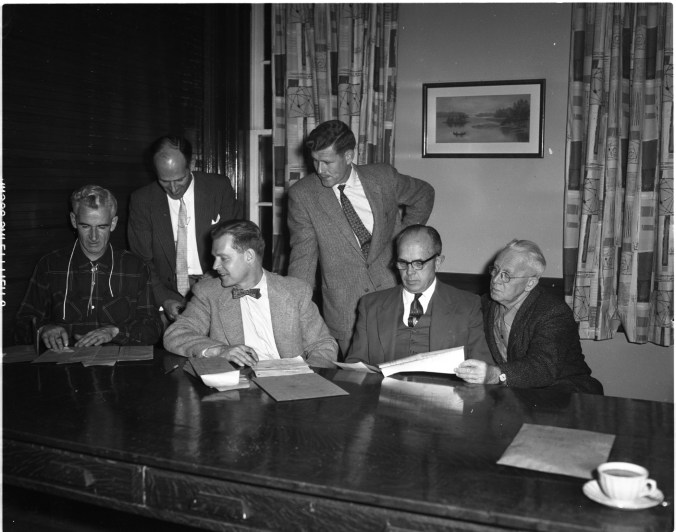 These men found much to be happy about as they gathered together Monday night to check first returns of Midland YMCA’s campaign to raise $10,500. They found that $6,179, or 69 percent of the objective had been reached so far. From left to right are; Harold Boyd, Ed B. Kendall, Frank Bray, Bill Thompson, Charles Vent, and John Bridges.
