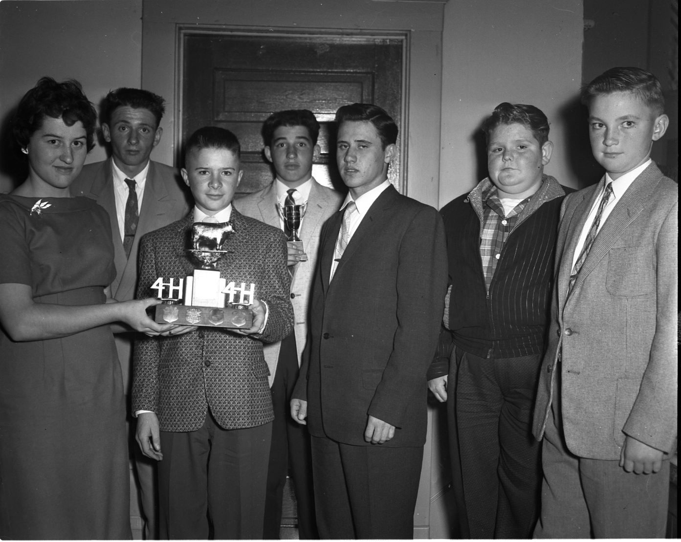 A very successful season for the Vasey 4-H Calf Club, which won a number of collective and individual County honors, was climaxed by an awards dinner in Vasey United Church Wednesday night. Sponsored by Tiny and Tay Agricultural Society and Vasey Junior Farmers, the calf club had 20 members this year. All but one of them achieved a total of 800 points or better, out of a possible 1,000, on their year’s work. Left to right are; Pauline Robinson, Bob Rawson, Blayne Edwards, Grant Robinson, Lloyd Curry, Bill Armstrong, David Jones.