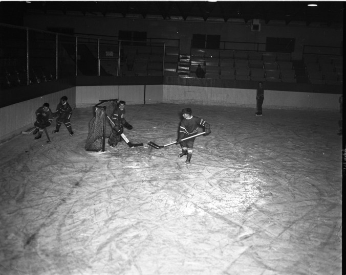 It seems like only a few weeks ago that Midland’s Little Leaguers, hockey version, were winding up their 1957-58 season. Wednesday night they were back again to start a new season. Action above shows a game between Toronto and the Canadiens in the National League section.