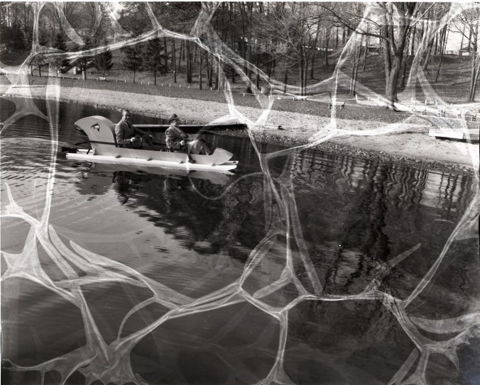 These miniature paddle-wheel “steamers” may be a feature attraction at Little Lake Park next year. Representatives of an Owen Sound firm which builds the Saranac paddle boats gave a demonstration of the craft’s features to members of the parks board Oct. 28. Commissioners Walter Wood (front) and Bill Murray are getting a firsthand view of the boat’s handling and safety qualities.
