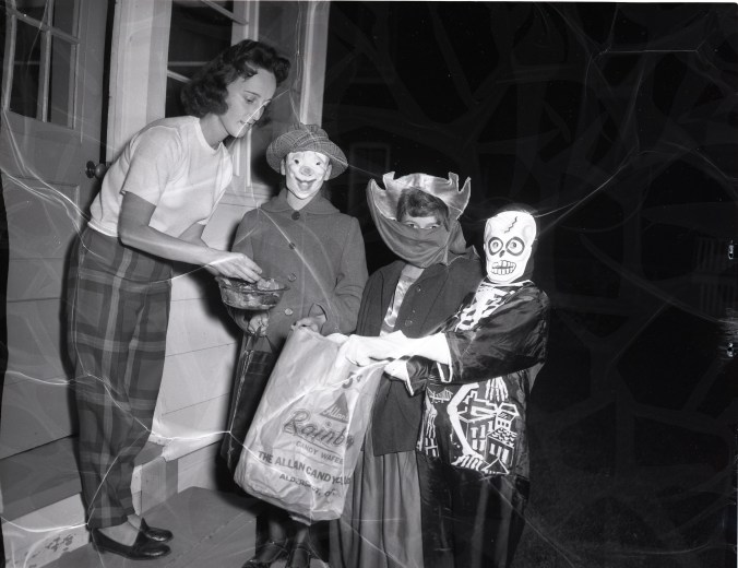 Near perfect weather made things pleasant for the “shell outers” in Midland Halloween night. Above, Mrs. Ernie Bates fills up the bag for some youngsters from the Russell-Dominion area. Police reported it was the quietest night in years.