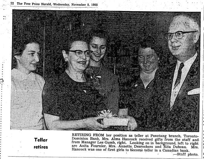 - One of Canada’s first female tellers, Mrs. Alma Hancock balanced her cash for the last time, Friday, Oct. 31, at the Penetang branch of The Toronto Dominion Bank, and started on a well-earned retirement. Contrary to the general opinion that women tellers were an innovation of World War II, Mrs. Hancock entered this branch of the banking service when manpower became scarce during World War I. Mrs. Hancock started as a stenographer in Midland when the manager of the bank of British North America received a call from his head office asking whether he knew of any girls who were good at figures, and who would like to enter the banking business. He knew of Mrs. Hancock, then Alma Beaudoin, and immediately mentioned her name. When she was contacted, Mrs. Hancock recalled: “I was very much thrilled and interested.” She was sent to Toronto head office of the bank where she learned the intricacies of dealing with money and finally arrived back in Midland in 1916 where she took over the teller’s cage. Speaking of the “cage” as it actually was at that time, Hancock said it gave one quite a feeling of importance to be standing, locked alone in a cage with cash in the drawer and spread out on the desk, “and a revolver by your side!” This brought up the question as to whether she ever had experienced a hold-up, to which she quickly, answered, “Oh, my goodness no. But I did detect counterfeit money on several different occasions.” The veteran teller said she had detected the spurious currency, each time by its “feel.” “The bills were very well printed, and I don’t think I could have told the difference by that, but the paper just didn’t have the right feel,” she said. She continued working in the bank for some 15 years until she married Bill Hancock, a well-known hockey coach. At that time she settled into the duties of a housewife and remained at home until early in the second World War. Short of help, with many of their employees joining the armed services; the manager of the Bank of Toronto at Penetang called on her for assistance. When her husband died before the employment emergency ended, Mrs. Hancock stayed on at her work and continued there until her retirement. Admitting she had worked for four different banks, Mrs. Hancock said, “and I never got away with a nickel of their money.” She started with the Bank of British North America; which eventually became the Bank of Montreal. In her second stint, Mrs. Hancock started with the Bank of Toronto, which became the Toronto-Dominion Bank only a few years ago. Summing up her banking experience, Mrs. Hancock said, ‘”The work was no hardship because I loved every minute of it. It is an interesting occupation, and I am sure that at my age I couldn’t have stood on my feet all day if I hadn’t been interested and liked it.” As to her retirement, Mrs. Hancock thinks she will continue to tend her garden which holds a great deal of interest for her. She would also like to do some travelling. Mrs. Hancock is a native of this district, having been born at Lafontaine, the daughter of M. Beaudoin, a well-known merchant of that village. He was also clerk-treasurer of the Township of Tiny for many years.