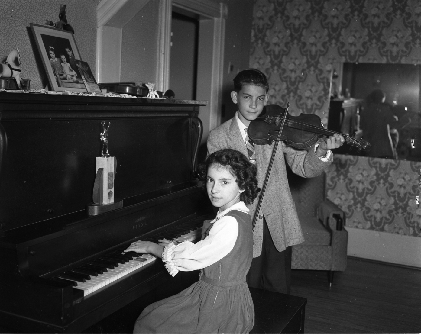 This musical pair is comprised of Mary, 10, and Lloyd, 14, children of Mr. and Mrs. W. E. Preston, Wyebridge. Mary was Lloyd’s accompanist when he won the amateur division at Peterborough’s first annual old-time fiddlers’ contest Friday night. Mel Lavigne of Honey Harbour won the professional section.