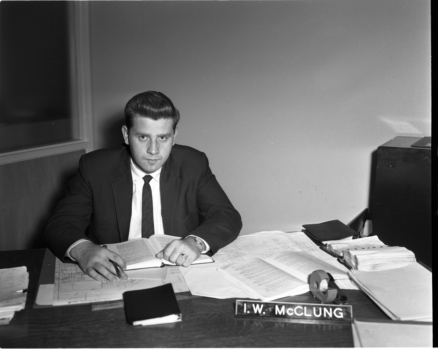 Formerly of Sarnia, Ian McClung is shown at work in his new office in Midland’s municipal building. He has been active in lacrosse circles for some years.
