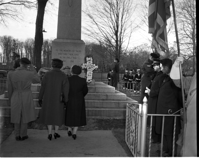 Incidentally, in the photo at the cenotaph, I am the soldier standing with rifle reversed at the right rear of the cenotaph. Front right is not easy to identify because the face is obscured, but probably was Sgt David (Davy) Bell. At the time I was a Trooper with the Grey & Simcoe Foresters, who at that time were an Armoured regiment, with a squadron in Midland. I remember the day well; despite it being dry, it was also very cold, and standing there in only battle dress and not visibly shivering was a challenge.