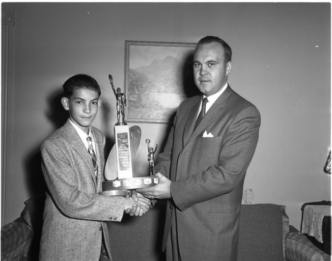 This handsome trophy presented for competition at Peterborough’s old-time fiddlers’ contest, will have the name of Lloyd Preston, 14, of Wyebridge inscribed on its base. A representative of Dow’s brewing company, donors of the trophy, George Gilmour of Peterborough is seen above with the young Wyebridge fiddler, who won the amateur section of the contest. Lloyd gets a smaller replica to keep permanently.