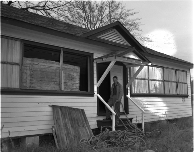 Annual damage to their chalet is getting past the joke stage to members of Midland Ski Club. Ross Irwin is seen retrieving tow rope that some persons started to lug off the property. Damage to windows and other parts of the building will cost nearly $300 to repair, Mr. Irwin estimated.