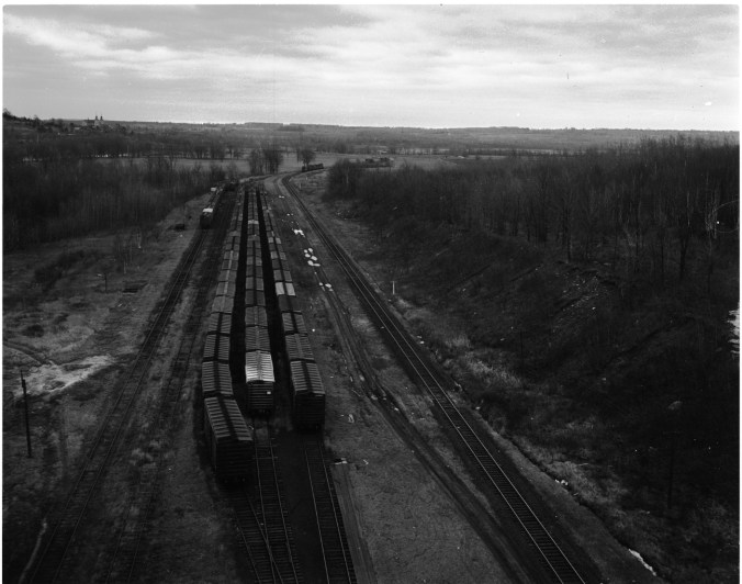 These three rows of boxcars, parked in the CNR’s Tiffin Yard, were later hooked up to make the longest grain train (more than 90 cars and 4,000 feet long) ever to leave Midland. Three big diesel units (visible near the top of the picture) were used to haul the train 200 miles to Belleville. Total weight of grain in the cars was more than 7,200 tons.