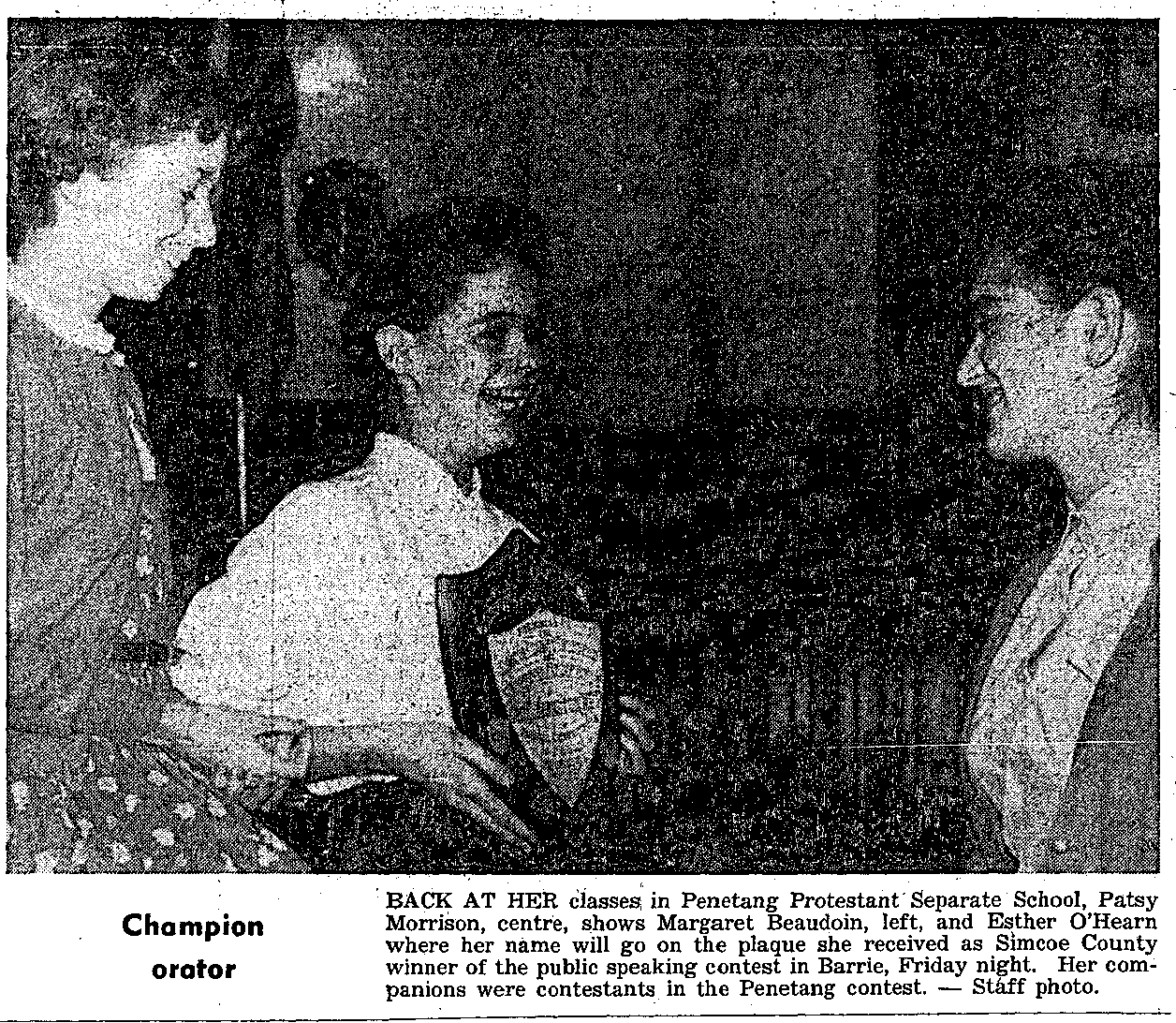 - Concerning the non-attendance of students under 16 years of age, Mr. Johnston stated that four students had been reported to the probation officer and the juvenile court. “The students have just not returned to school,” continued Mr. Johnston. “It would appear to me that the parents and students are defying the laws of the province. In each case, the family allowance cheque has been cancelled for the particular child. The biggest problem we are facing is the disinterest of pupils and parents.” Asking if drop-outs were due to financial reasons, board members Dr. A. H. Pinchin said he understood 40 percent of provincial bursaries were not being used. Mr. Johnston replied that he did not feel the drop-outs were for financial reasons. While he felt it might be true, province-wide, that 40 percent of the bursaries were not used, he added that two-thirds to three-quarters of the value of bursaries for Simcoe County were being used by MPDHS alone.