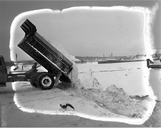 Finding a place to dump the thousands of tons of snow dumped on Midland streets during recent storms is almost as much a problem as clearing the streets in the first place. Midland harbour provides a convenient place but even this gets plugged eventually and must be plowed under by the CSL tug Tiffin.