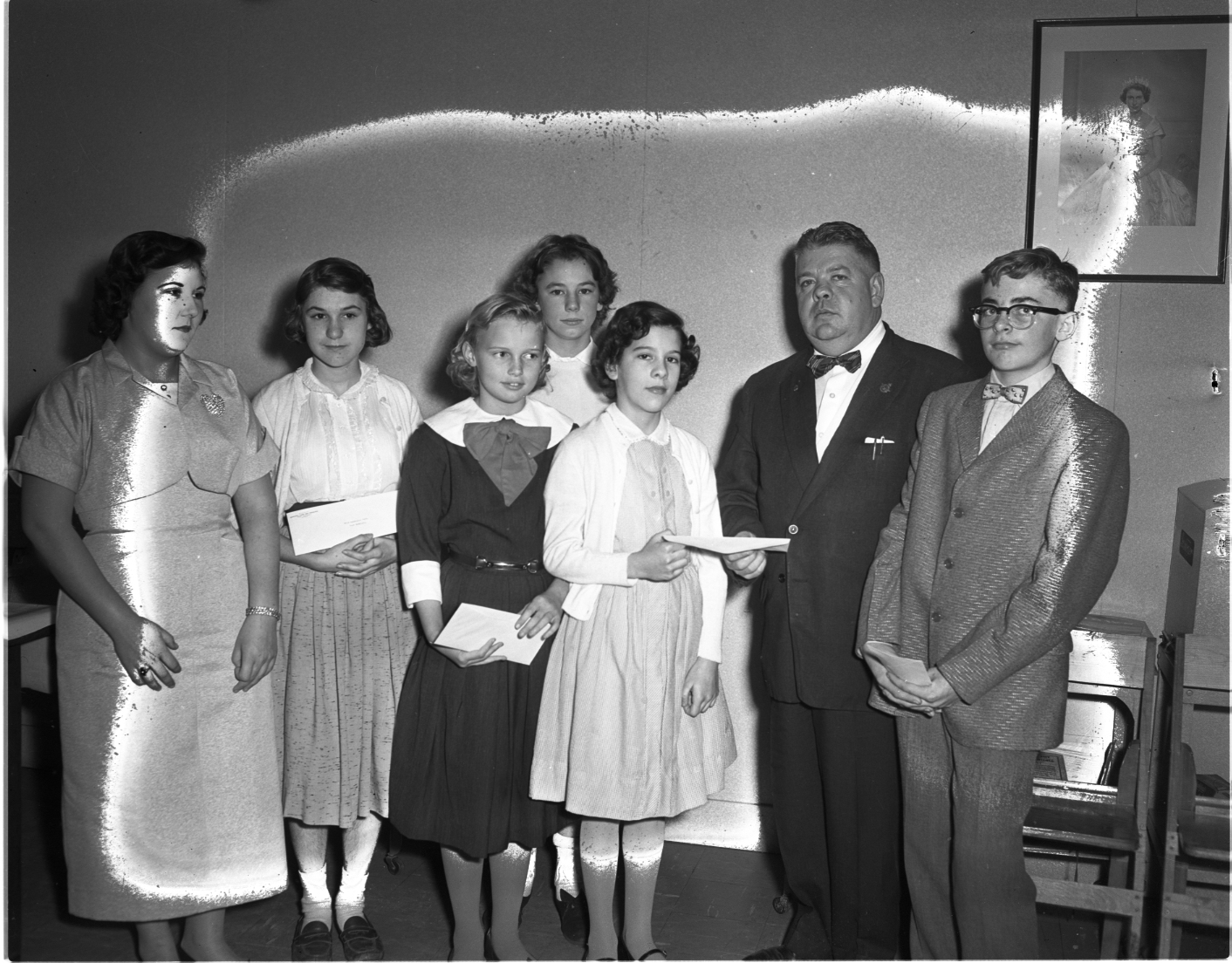 Port Legion President Russell Coughlin (who is also a member of the school board) presents prizes to these Grade 6 and 7 pupils. Left to right are Brenda Latondress, Annabelle Todd, Joky Van Pypen, Heather Hartford Judy Coughlin, Mr. Goughlin, and Francis Kelly, the lone boy among the nine winners. The presentations to top pupils were made Friday night.