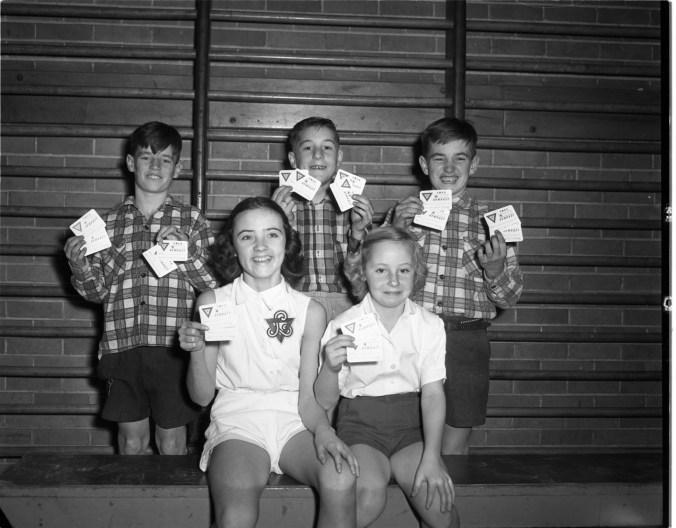 Winning their certificates for feats on the gym floor, brought big smiles to these young members of Midland YMCA. Girls are Linda Duggan, left, and Barbara Ann Spence, boys are Gerald Jeanotte, Allan Cornell and Ronnie Jeanotte.