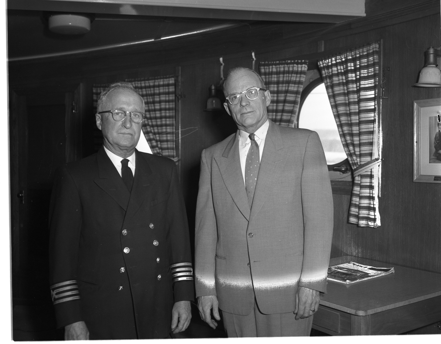 Well known in Midland, where he received his early education Capt. John Wesley Scarrow of Hamilton, left, ended a 46-year sailing career when the Sir James Dunn docked at Tiffin elevator, Midland, Friday. On hand to wish him well in retirement was J. A. Hill, Tiffin superintendent.