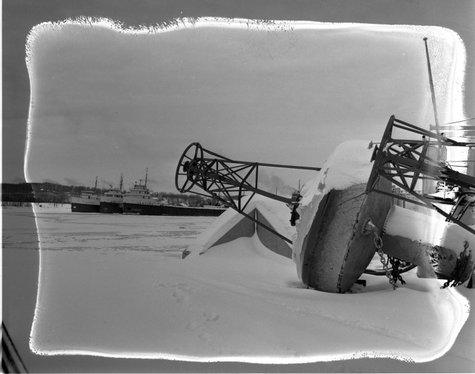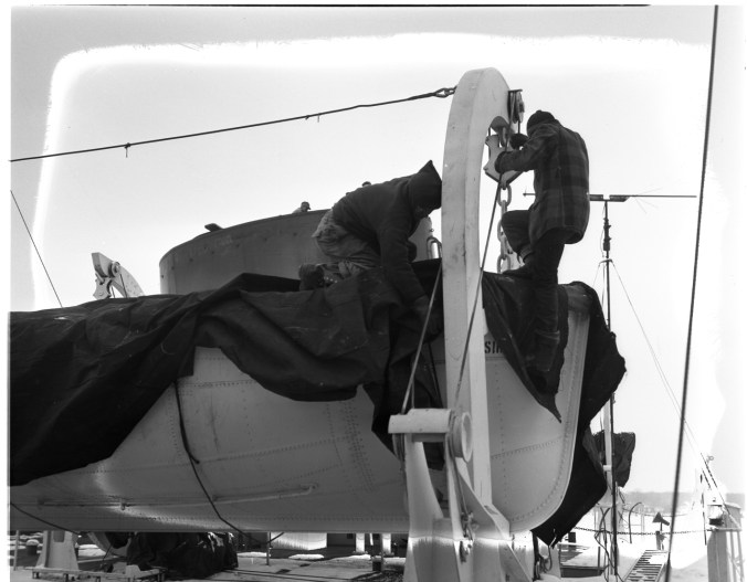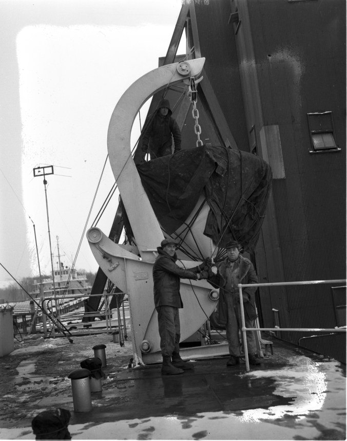 There’s nothing much colder than the top decks of the big bulk freighters at this time of the year; as numbed fingers fumble with icy ropes in the annual tie-up. Men in the foreground are placing a tarpaulin over a lifeboat on the Sir James Dunn. Other workmen in the background are performing a similar operation on the funnel of the Thunder Bay. Both CSL ships will winter at Tiffin elevator, Midland.