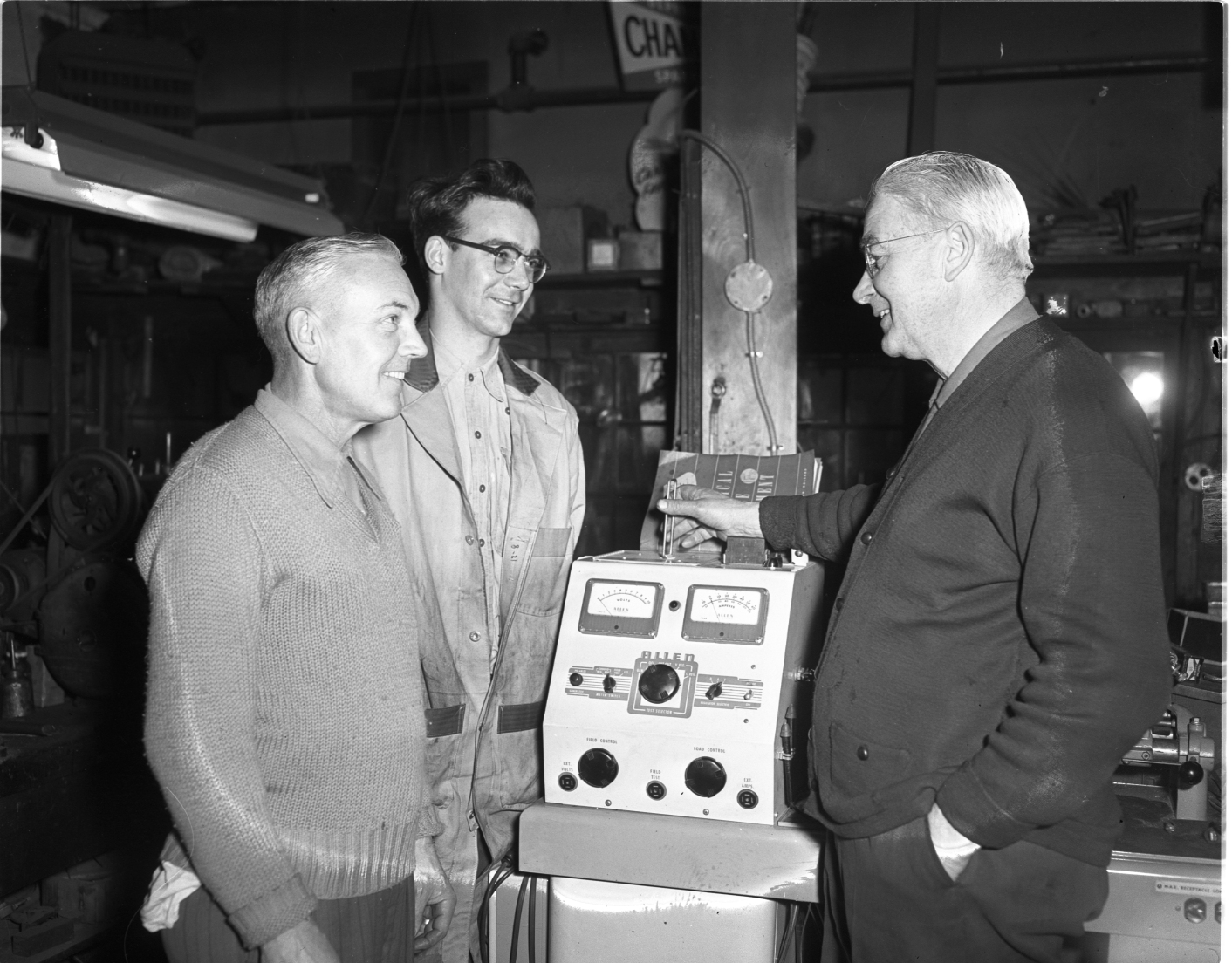 After some 37 years in business in Midland, George Parr, right, has sold his battery and auto electric business on Bay Street. New owners are Les Cammerer, left, and his son-in-law, Bill Sutton. Mr. Parr will remain with the new firm for some time, he indicated last week.
