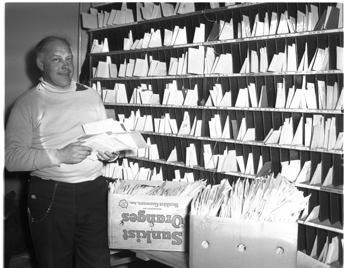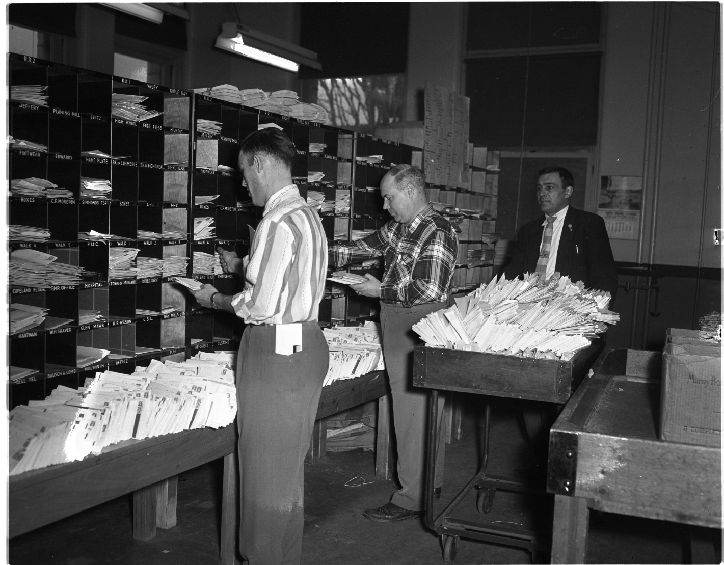The thousands of letters and postcards seen in the picture above long since have reached the homes of Midland residents. Only a small part of Wednesday’s incoming mail, the letters are being sorted into carriers boxes by Fred Grigg, Roy Mitchell and Chuck R. Stelter, left to right. Many additional helpers are being employed by Postmaster W. F. Bourrie to assure prompt delivery of Christmas mail and parcels.