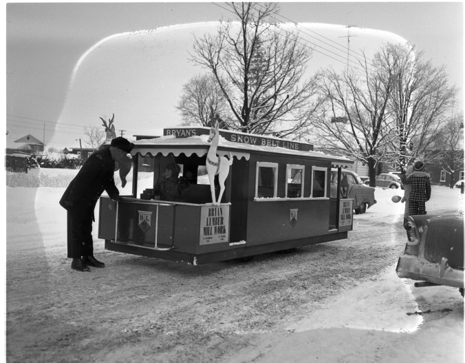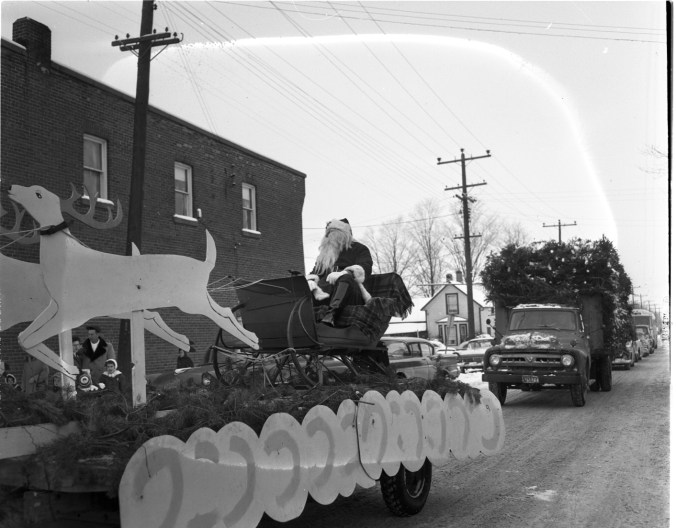 A miniature streetcar and the traditional reindeer and sleigh provided part of the transportation at Elmvale’s Santa Claus parade Saturday. In this picture, Chief Horace Elwell gives a few tips to the youthful driver of the “streetcar”. Santa in the lower photo, of course, needed no tips on how to drive reindeer.