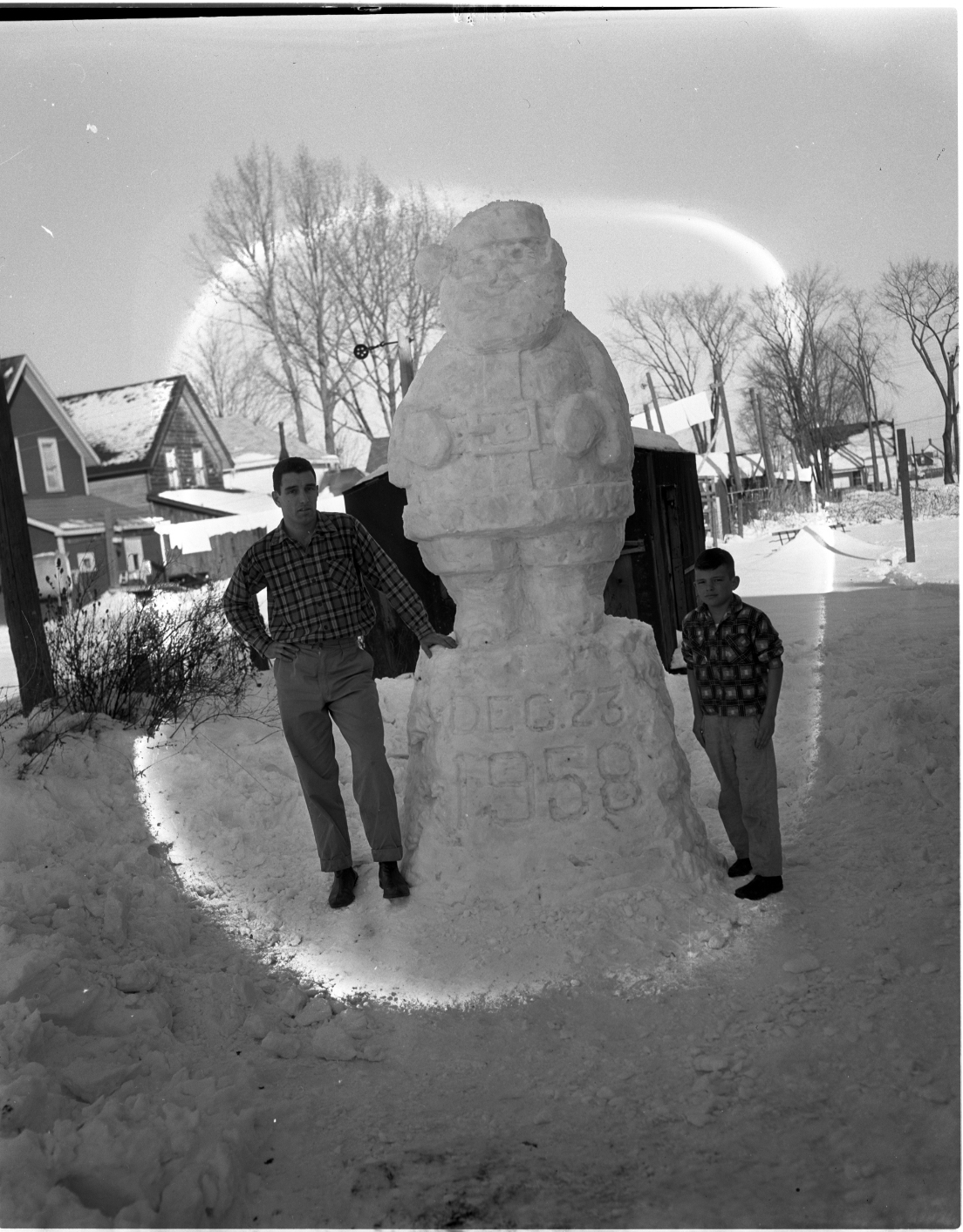 This giant Santa Claus made of snow has attracted a lot of visitors to 267 Lindsay Street, Midland, during the holidays. It’s the product of Ken McFarland and his younger brother, Albert. The huge figure dwarfs the brothers who made it.