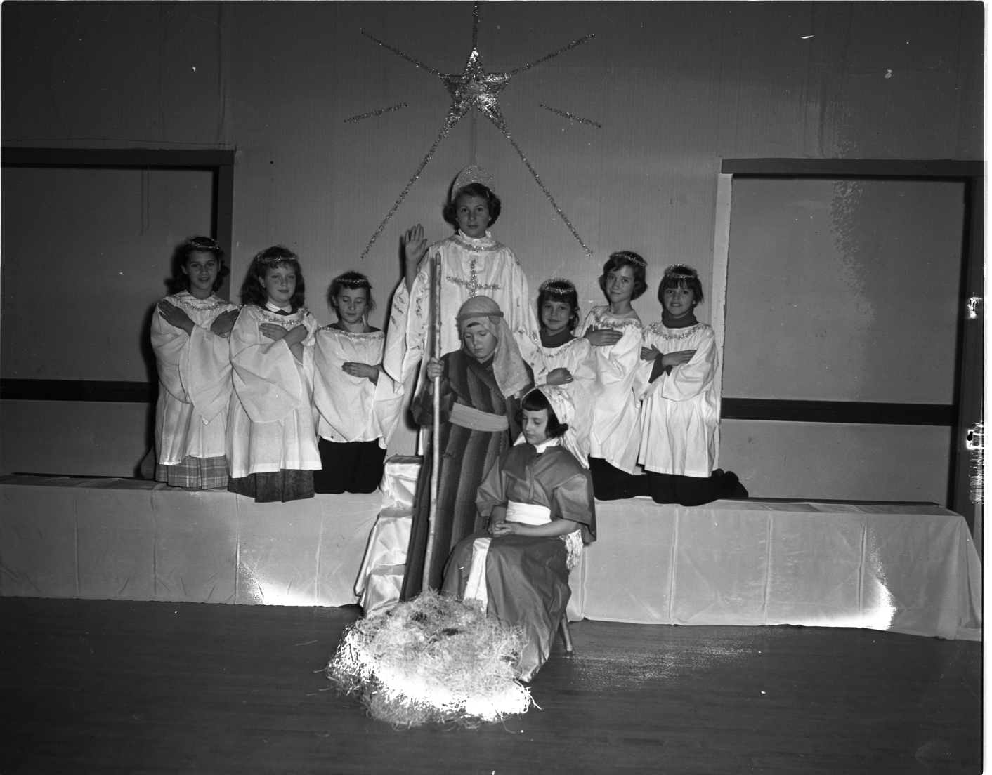 At this time of year, children in many lands will be enacting the old and loved Christmas story. The First Midland Brownie pack is one of these groups. They staged their play at St. Mark’s parish hall Saturday and will do so again Friday night. Taking part are, left to right, back row: Jan Worrell, Debbie Bertrand, Joyce Ferris, Carol Banting, Cynthia Lamorandiere, Anne Delaney, Beverley Lamorandiere; front, Barbara Lloyd (Joseph) and Sandra Nesbitt (Mary).