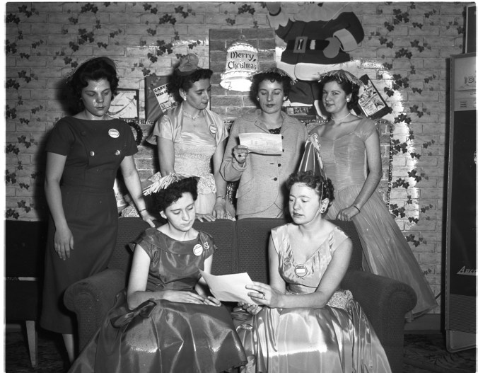 Helping with the prize list at the Shoe Corporation Christmas party at the Roxy Saturday were the six young ladies seen above. Left to right are, seated, Arlene Vaillancourt and Mrs. Miles Blackhurst (Grace Edgar); standing Margaret LaGrandeur, Doreen Cascagnette, Joyce Quesnelle, and Betty Anne Mayer. Several hundred youngsters from Midland and Penetang branches of the firm attended the party.