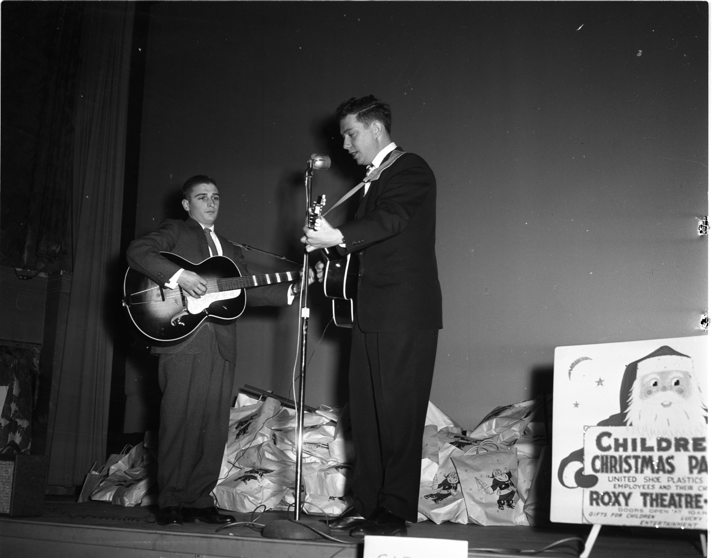 There was plenty of entertainment as well as gifts for children at the Shoe Corporation Christmas party in Roxy Theatre Dec. 20. Among the entertainers were John Geere and Marc Gignac, from Penetang’s Fern Shoe plant.