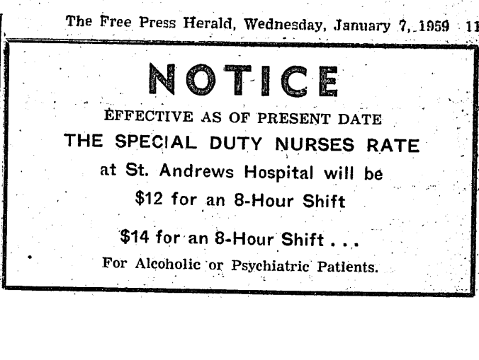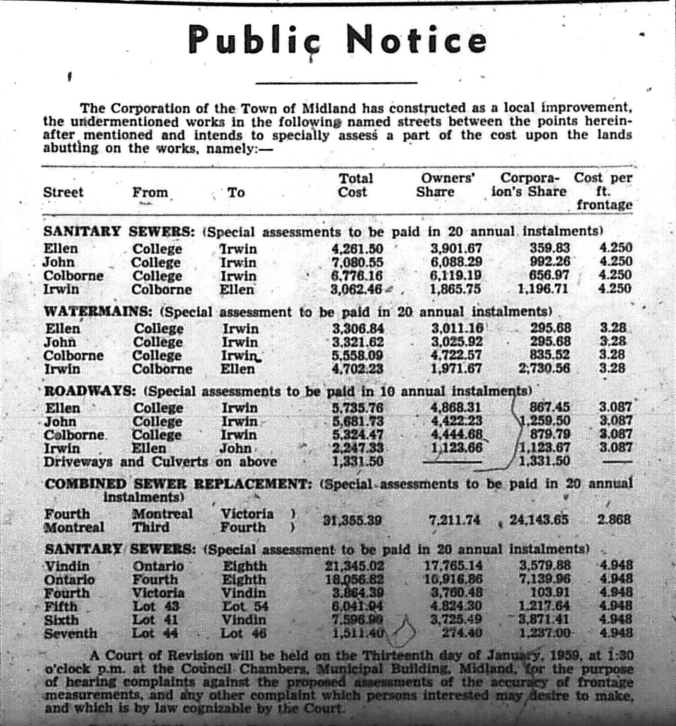 - Free Press Herald headline of Wednesday, January 7, 1959; Damage Tops $3,000 in ‘Crack-up’ in Midland. Four persons were injured Saturday evening and property damage was estimated at $3,300 in one of the most severe two-car collisions on Midland streets in several years. Still in St. Andrews Hospital are Miss Violet and Miss Gladys Edwards, well-known Midland sisters who reside on Elizabeth Street. Violet Edwards suffered a broken collarbone and several fractured ribs. Her sister received broken ribs. The driver of the car in which the sisters were riding was Captain Dalton Hudson, Midland Ave. He suffered injuries to his ribs and back. His wife, also a passenger in the car escaped injury. The driver of the other vehicle involved, Clarence Hall, 27, of Quebec Street, received rib and leg injuries. A transport driver, he was travelling alone in his car at the time.