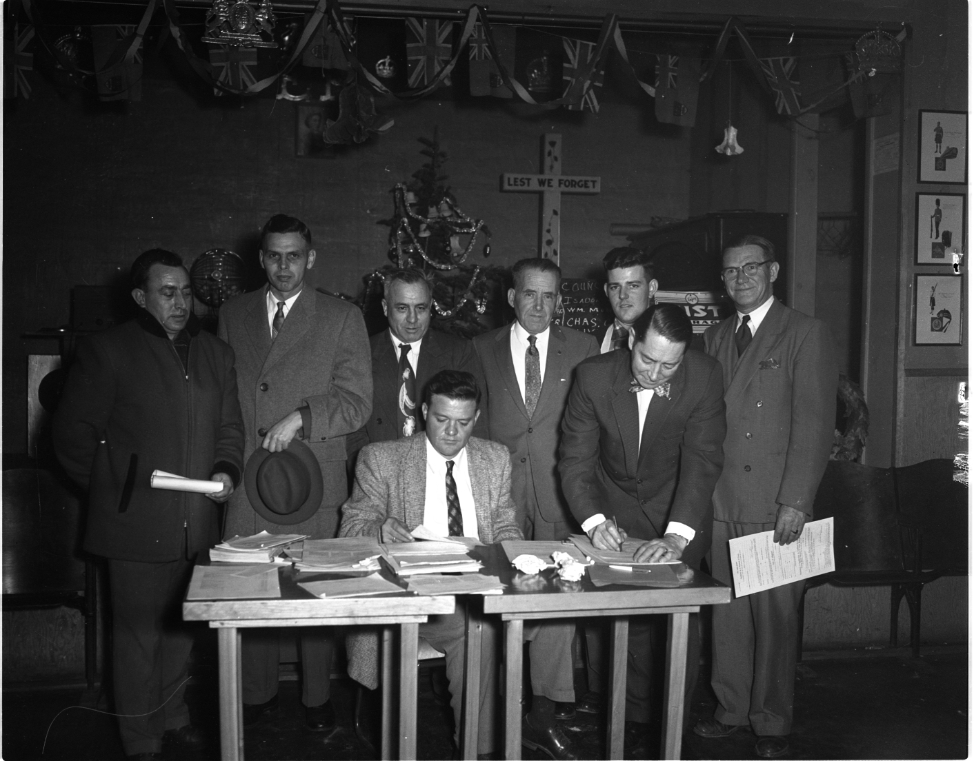 There will be elections in Victoria Harbour Monday for both council and school board. Several of the candidates are seen on nomination night as they watch Reeve Ernie Cadeau sign qualification papers. He was returned by acclamation. Left to right, standing, are Isadore Bressette and Theodore Bernard, who will seek election as councillors; Wilfred Savage, Charles Gillan and Cecil Walker, members of the 1958 council who will seek re-election and Lorne Bell, who will try for another term on the school board. Seated is village clerk Jack Westwood.