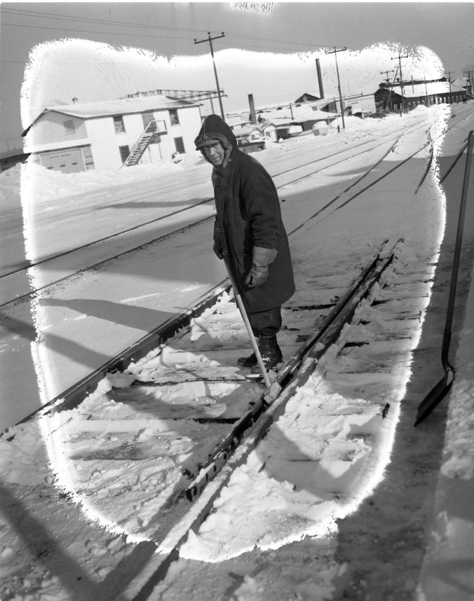 “Working on the railroad” is not an easy task for the section men at any time, and it’s even less so in winter. Frank Taylor got himself well bundled up before going out to clear switches in Monday’s sub-zero temperatures.