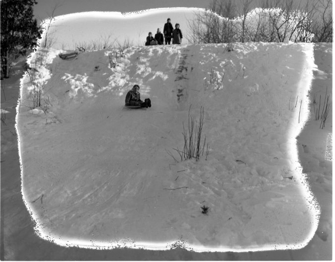 This has been a wonderful holiday season for the children, with plenty of snow and ice to try out Christmas toboggans, sleds, skis and skates. This small hill in Victoria Harbour provided lots of fun for Joanne LaChapelle and her flying saucer as her young companions await their turn above.