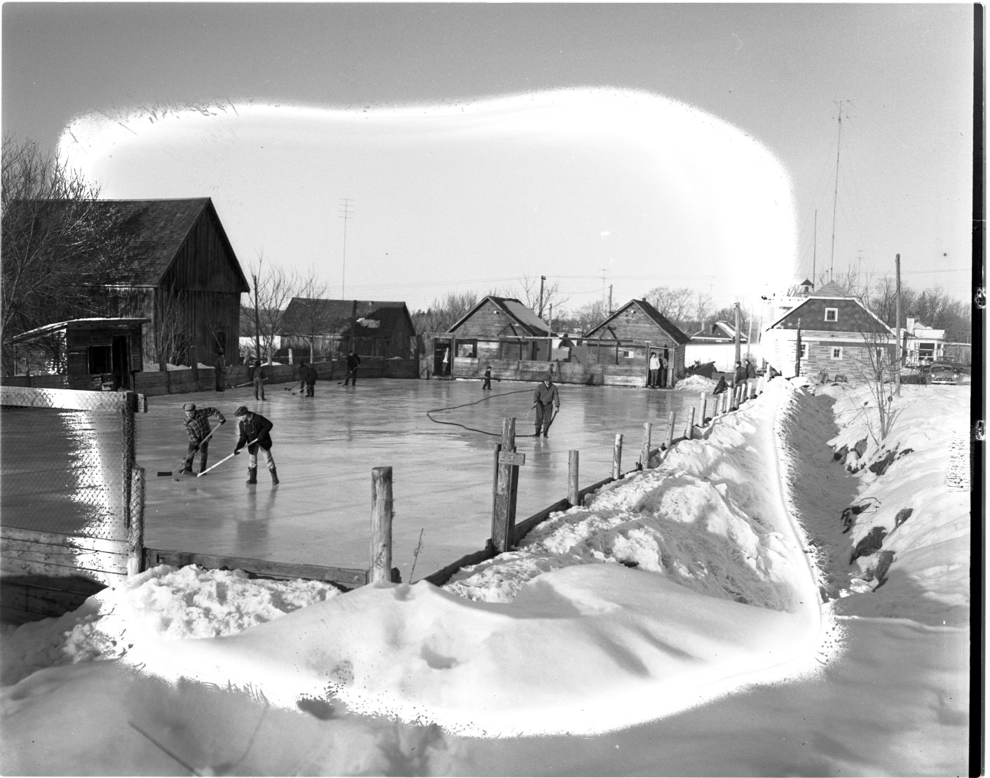 While it may not rival Maple Leaf Gardens, this open-air rink is a welcome sight as far as the children of Victoria Harbour are concerned. Above, flooding goes merrily on while Jim LaChapelle and Doug Brodeur engage in a bit of “shinny” in the foreground. Operation of the rink is in charge of a committee headed by Councillor Cecil Walker.