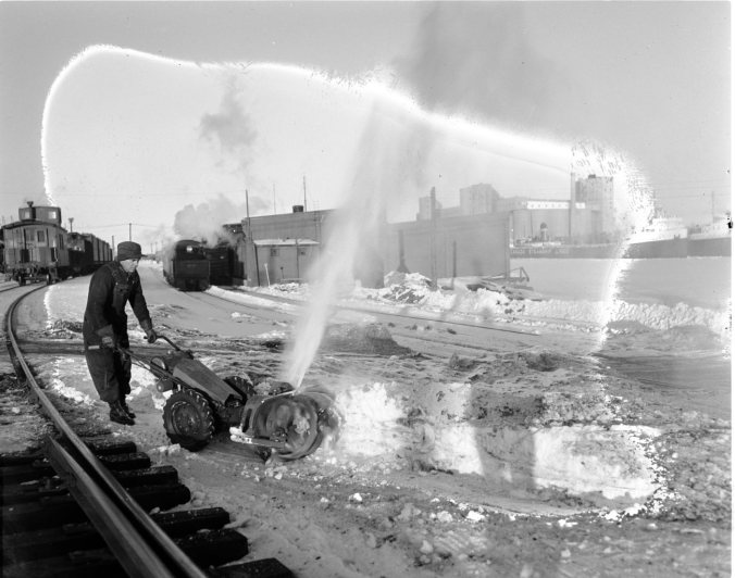 Many of North Simcoe residents, who are tired of wielding snow shovels during the constant snow storms, will envy Pat Dutton as he clears snow from around the tracks with a miniature snow blower in the CPR yards at Port McNicoll. The machine is of special value as the deep snow is now hard-packed by recent . . .(Caption damaged)