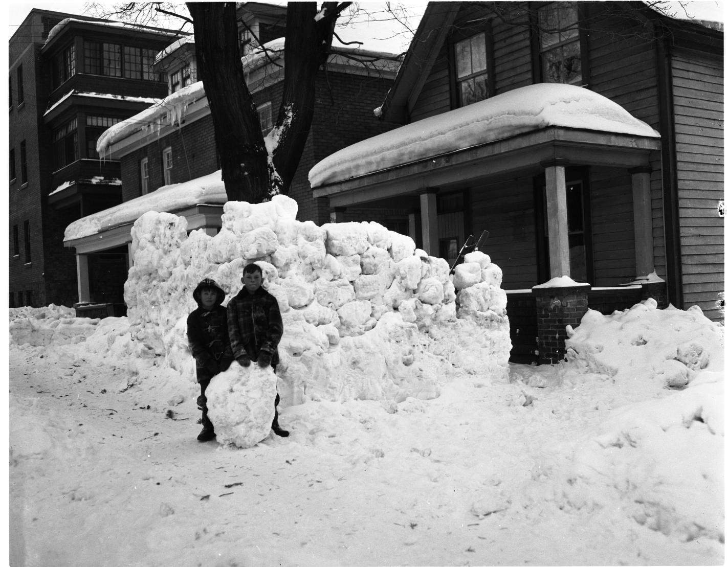 “Holding the fort” in front of Mrs. D. Evans’ home at 290 Queen Street, Midland, are George Hutchinson, left, and Bill Black. The two lads, along with Don Evans and Sid Hutchinson, built the eight-foot-high snow fort during the Christmas holidays. (Tanner apartments in the background.)