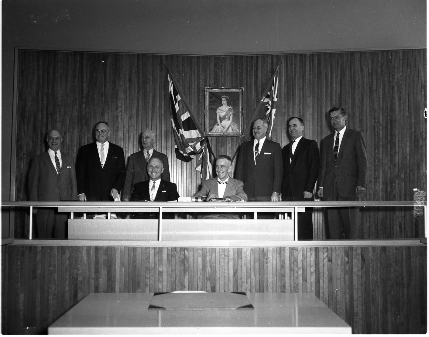 Big smiles light up the faces of Midland’s 1959 council as they posed for the cameraman following inaugural ceremonies Monday. Left to right are, seated, William Hack, clerk-treasurer, and Mayor Charles Stevenson; standing, Aldermen James Mackie and William Orr, Reeve W. H. Keller, Alderman Clint Smith, Deputy-reeve Herb J. Beauchamp, and Alderman Douglas Haig.