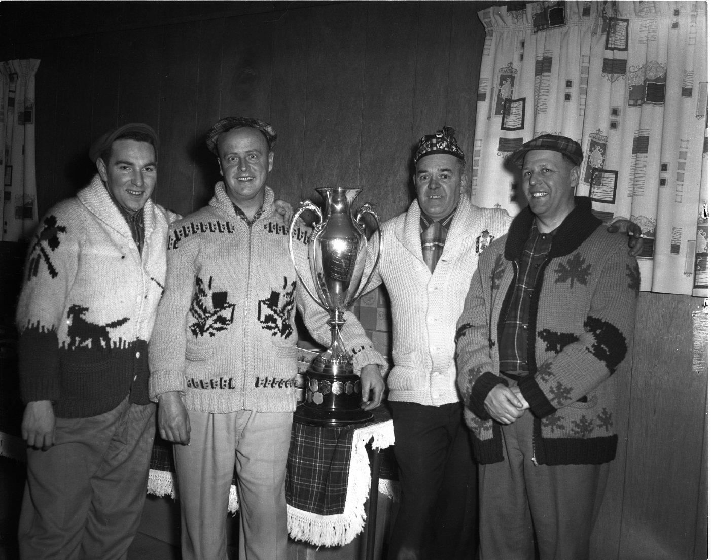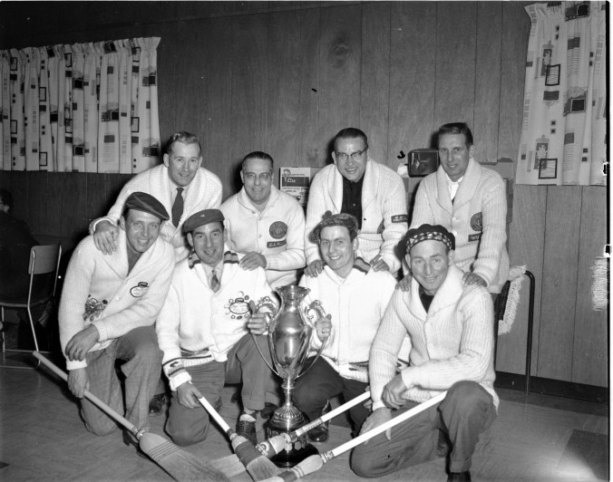 The Imperial Oil trophy was the goal of 20 rinks which took part in a one-day spiel at the Midland Curling Club Saturday. Lloyd Wilcox’s Midland rink proved the eventual winners in a photo finish over Wilf Parker’s Toronto High Park rink. Winning rink, seen in the top photo, was left to right, Graydon Rodgers, Lloyd Wilcox, Lawrence Wilcox, and “Woody” McConnell. Behind them are Joe Sibbald, Jack Russell, Bill Adams, and Wilf Parker. In the lower photo, Murray Yorke, Jack Duggan, Armand Robillard (skip) and Les Barber also came close and did win first prize in the 9 o’clock draw. (My dad, Les Barber, would be forty years old in August of 1959. His rink was the last to win the IOL trophy and it sat in our basement for years before I donated it to the Huronia Museum. It has since been loaned by the museum to theMidland Curing Club for public display.)