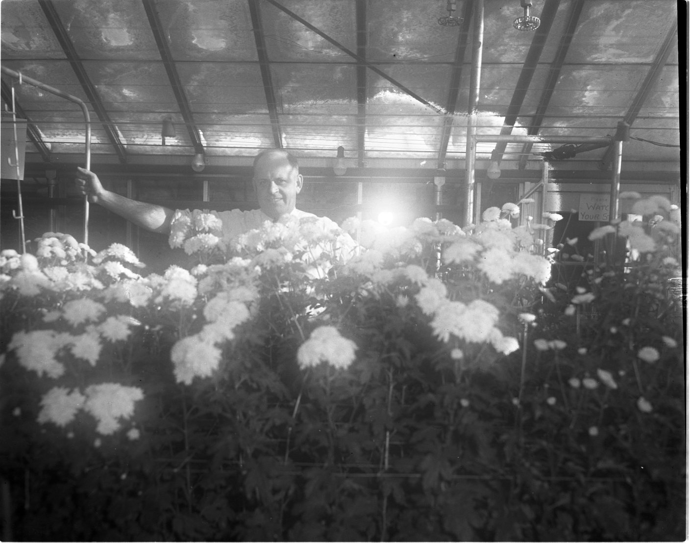 Cold, who’s cold says Midland florist Mac Perrin as he basks in 67-degree temperature behind a cheery bank of white and yellow mums. Mac joined the other grumblers when he had to go a few doors up the street for his new 1959 licence plates. There was a 77-degree difference in temperature between inside and outside the greenhouse even at 9 a.m. Monday, one of the coldest days this winter.
