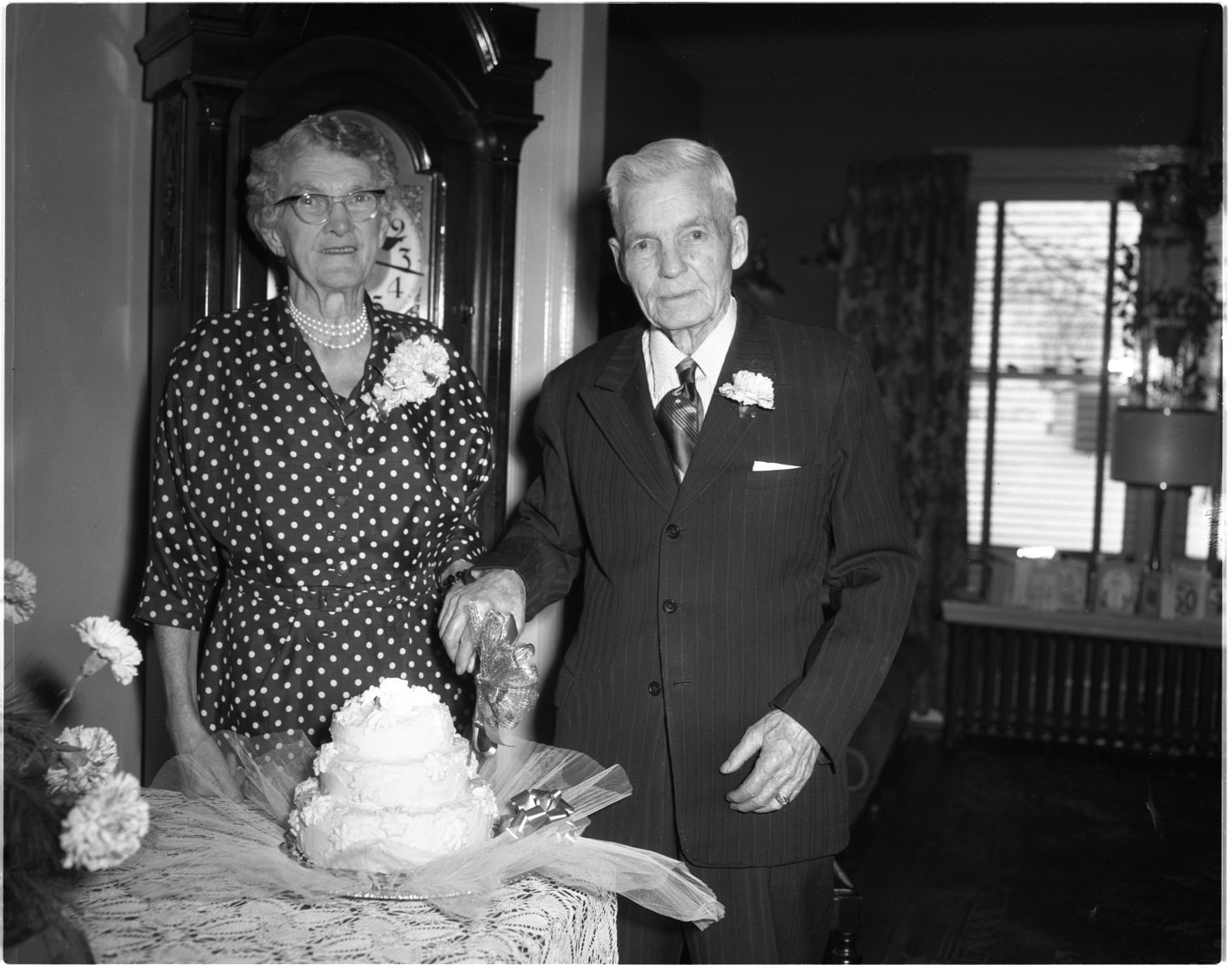 Cutting their golden wedding anniversary cake are Mr. and Mrs. Albert Ovell of 242 William Street, Midland. In 1886 Mr. Ovell emigrated to Canada on his own at 9 years of age. In 1907 he moved to Midland and worked constructing the Tiffin elevator, then the CPR elevator in Port McNicoll, before settling down to a permanent job at the Aberdeen. His wife is the former Emily Jane Jennett from Medonte.
