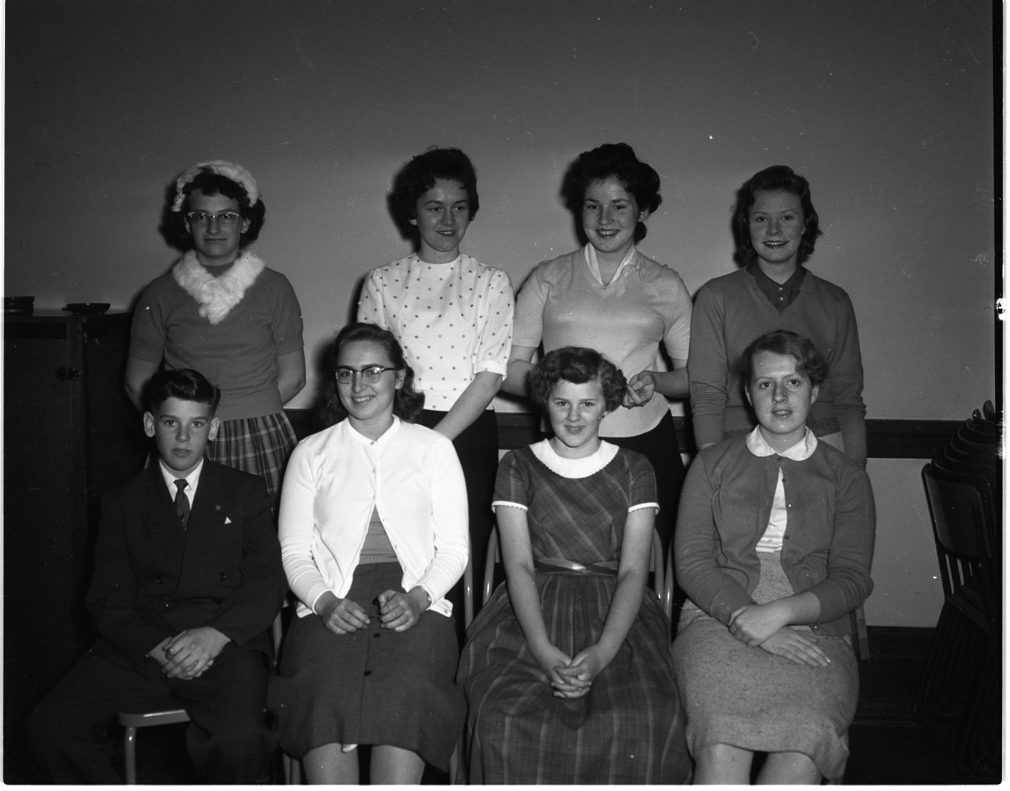 These pupils submitted prize-winning posters in the contest sponsored by the Women’s Christian Temperance Union in Midland schools. Left to right, front row, are Brian Dunn, Beverley Thompson, June Brownlee, and Donna Lovell; back row — Janette Setterington, Gitta Duwe, Charlotte Lamour, and Deanna Boyce. Awards were presented by Mrs. Charles McElroy and Mrs. J. E. Shaw, including a provincial award to Beverley Thompson.