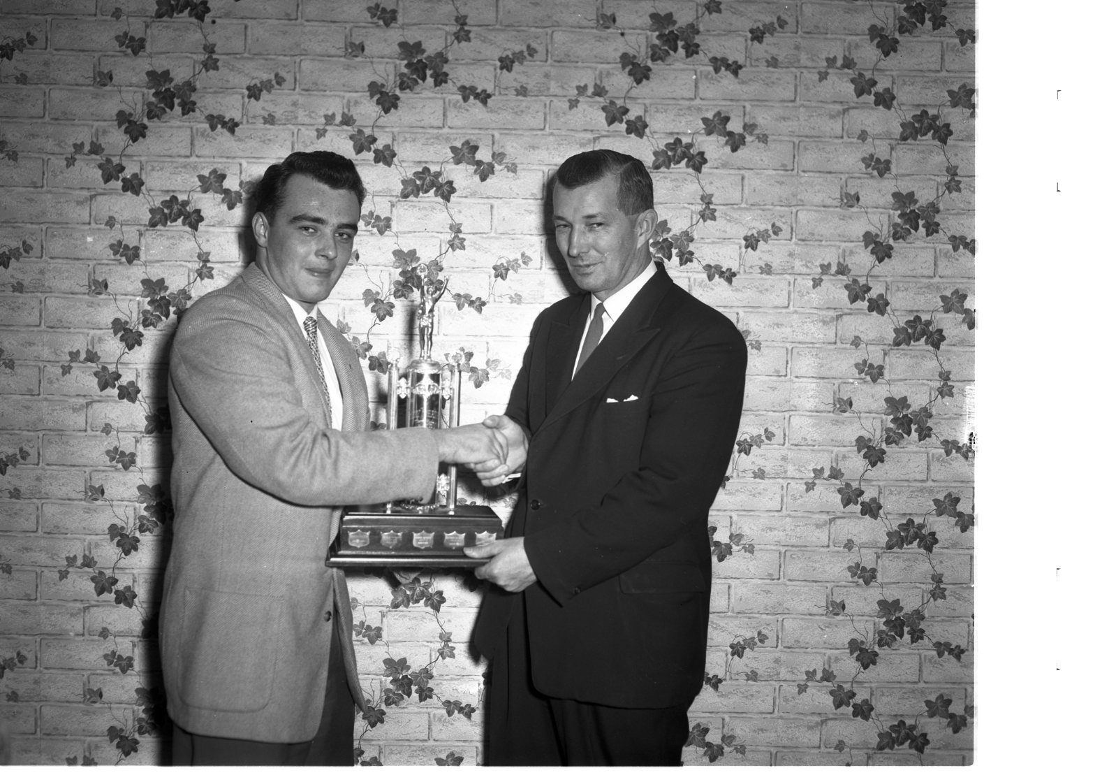 Each year, the Roxy Theatre trophy is presented to the senior boy student at MPDHS who best combines scholarship, leadership, sportsmanship and other qualities. This year’s winner, Wayne Morrison, left, is seen receiving the trophy from Rev. J. L. Self. Wayne is the son of Mr. and Mrs. Karl Morrison, Elizabeth Street.